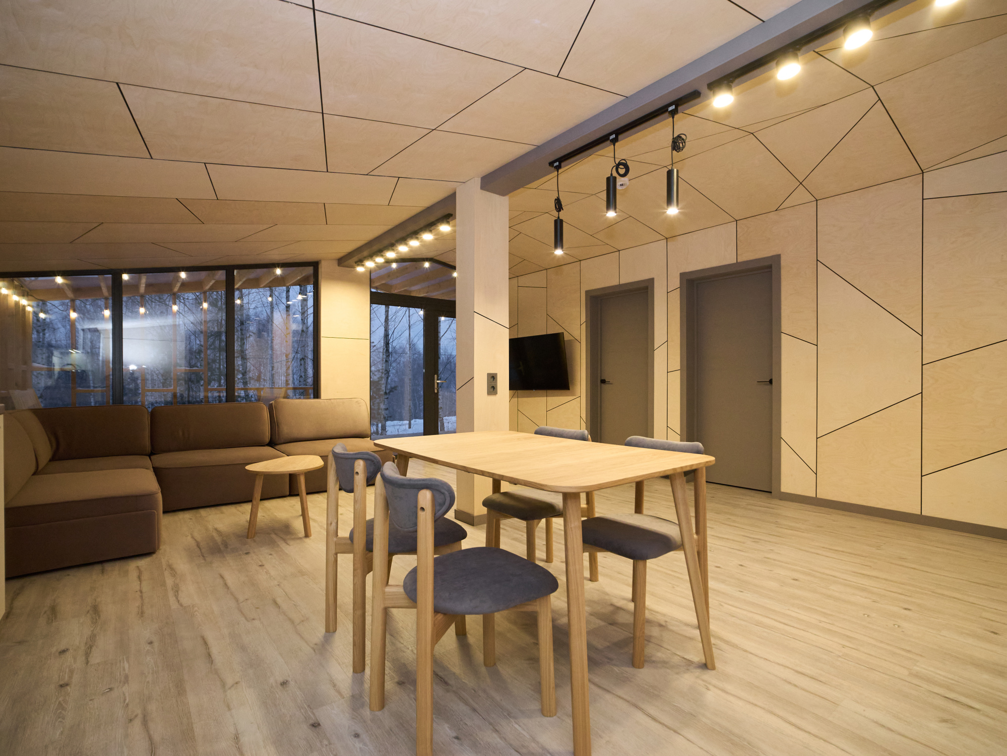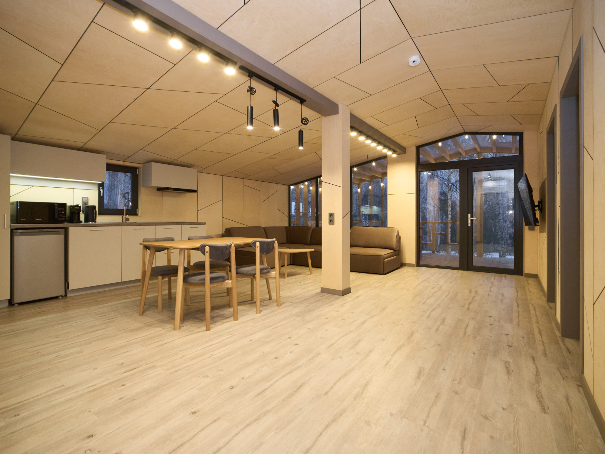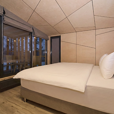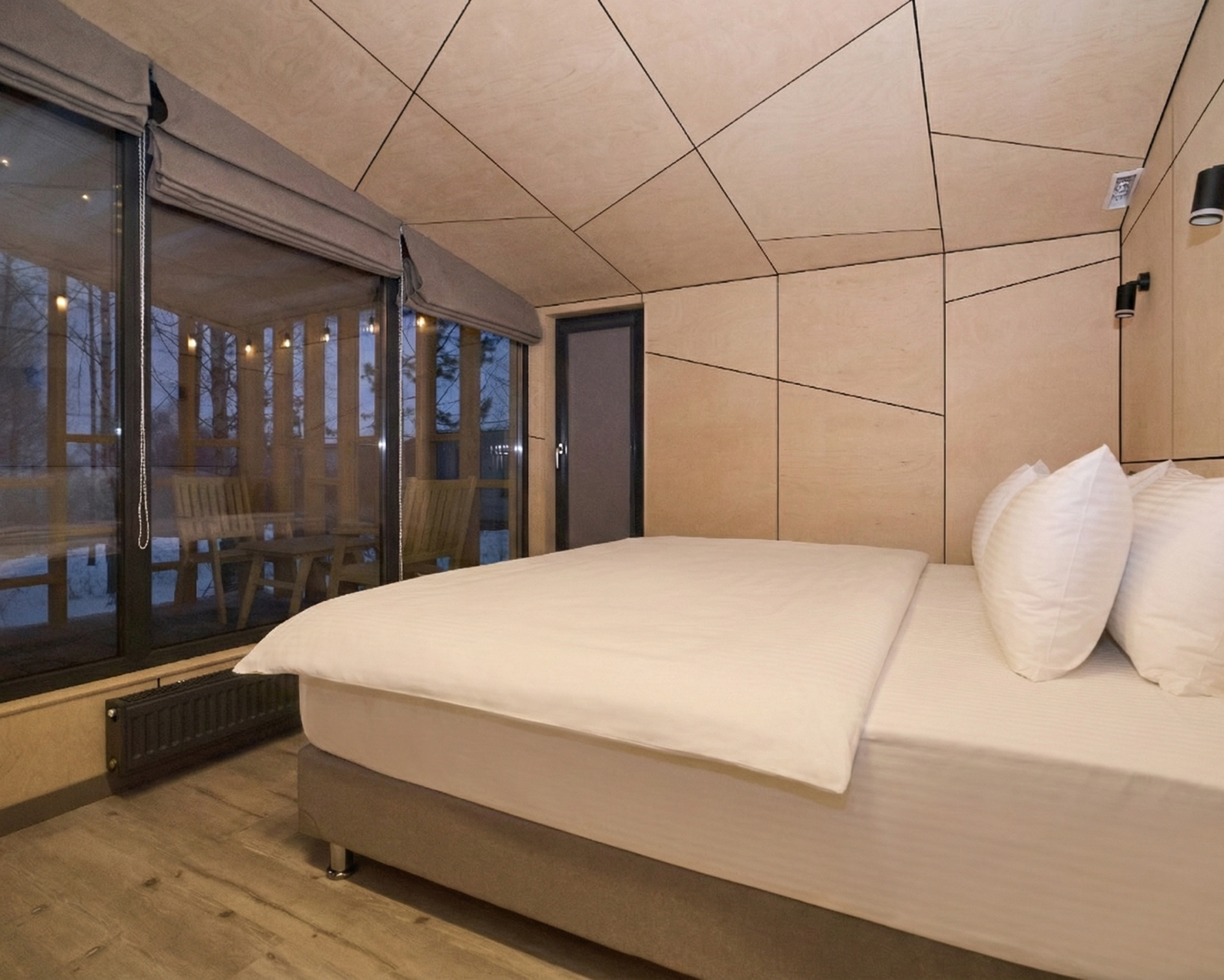 - просторная спальня-гостиная с большой двуспальной кроватью и панорамными окнами, из которых открывается вид на лесной массив (двуспальная кровать трансформер и раскладной диван)