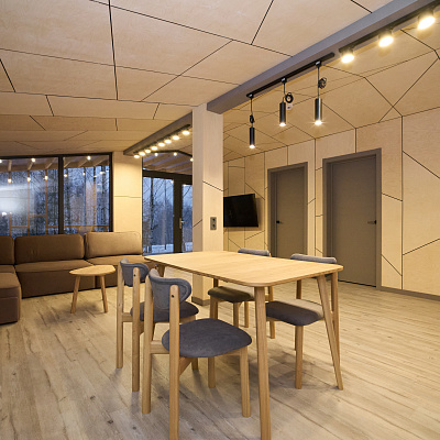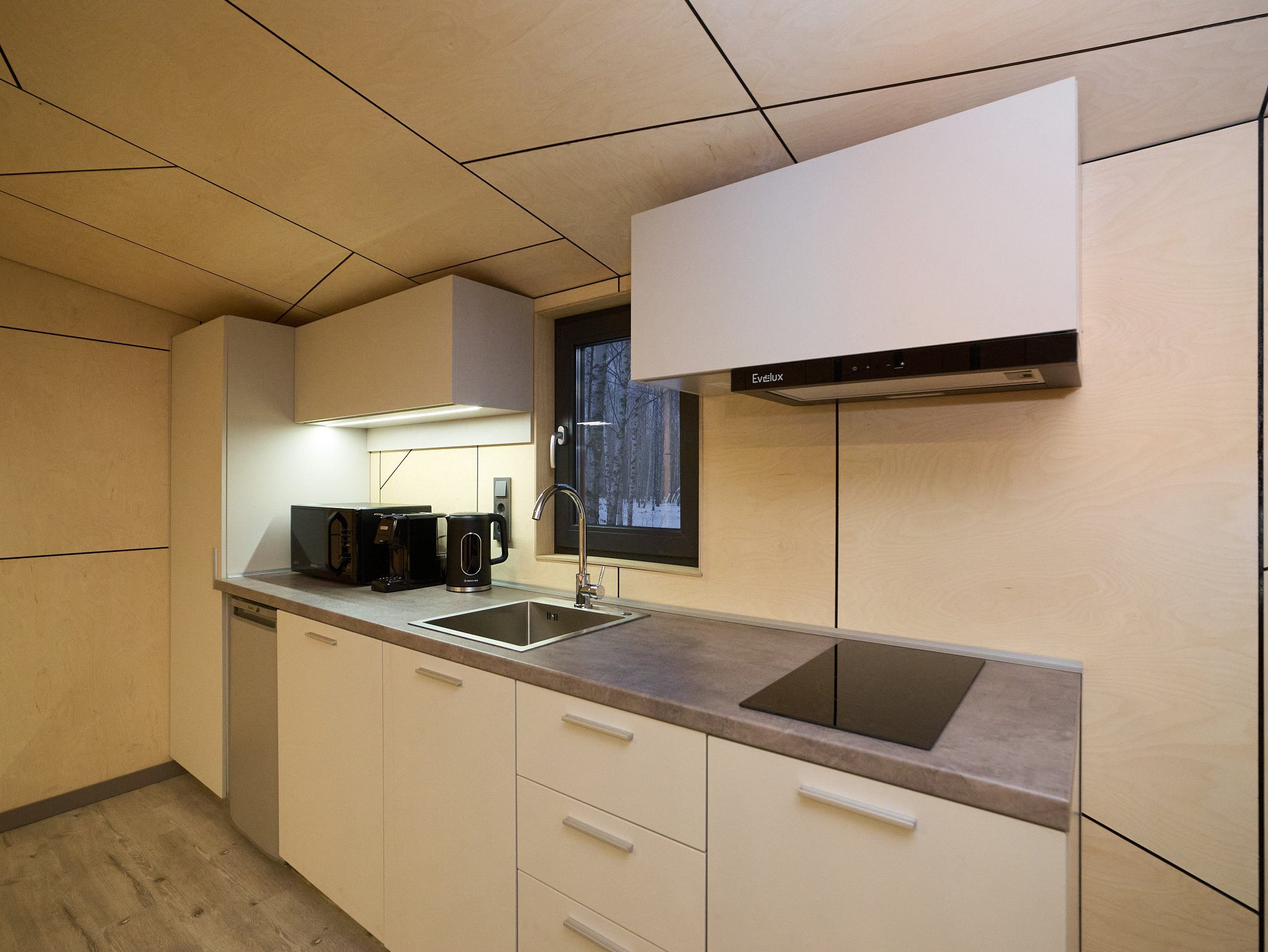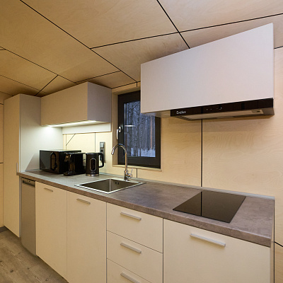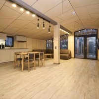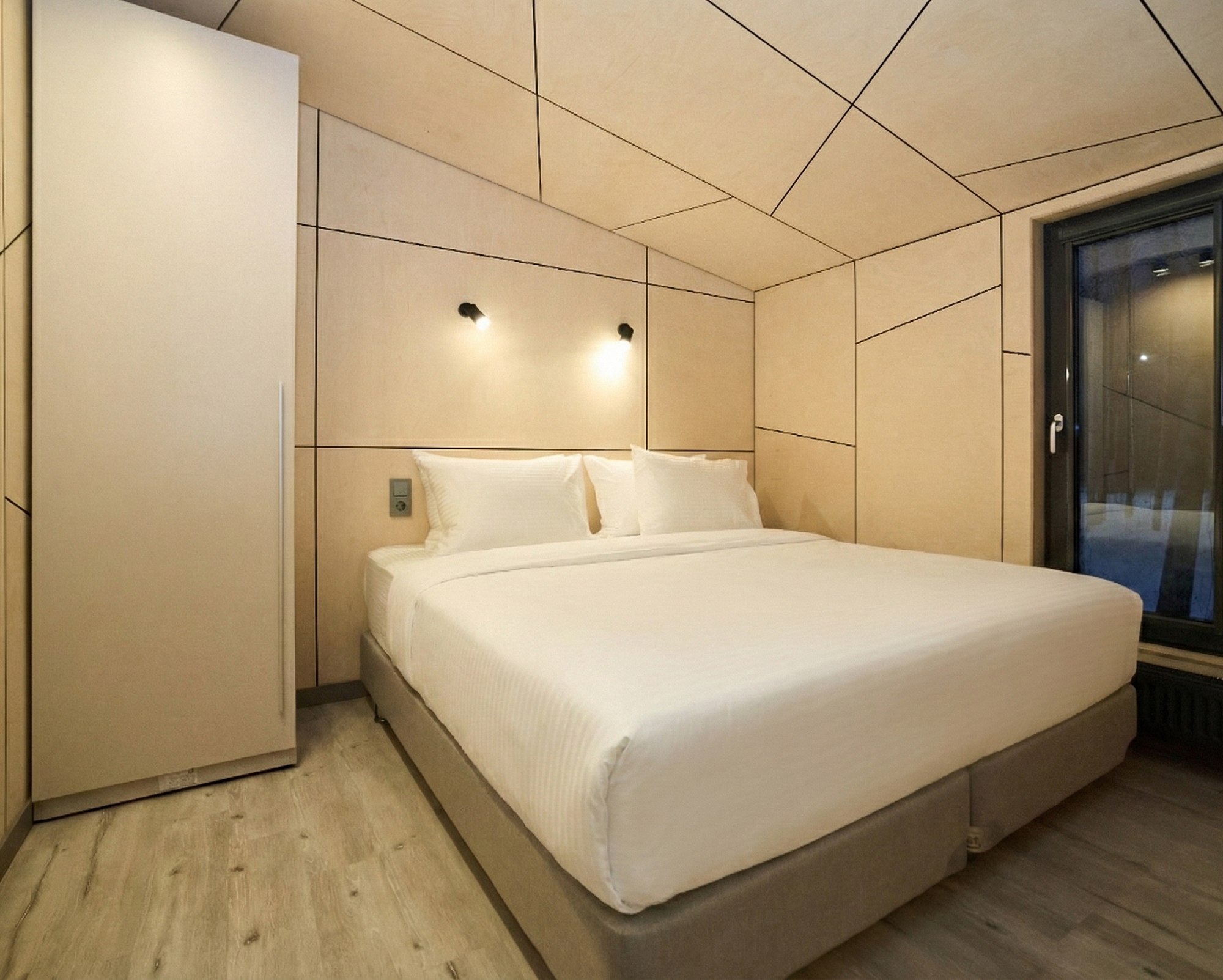- просторная спальня-гостиная с большой двуспальной кроватью и панорамными окнами, из которых открывается вид на лесной массив (двуспальная кровать трансформер и раскладной диван)