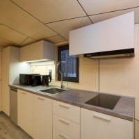 - современная кухня с варочной панелью, холодильником, кофемашиной, СВЧ и посудой